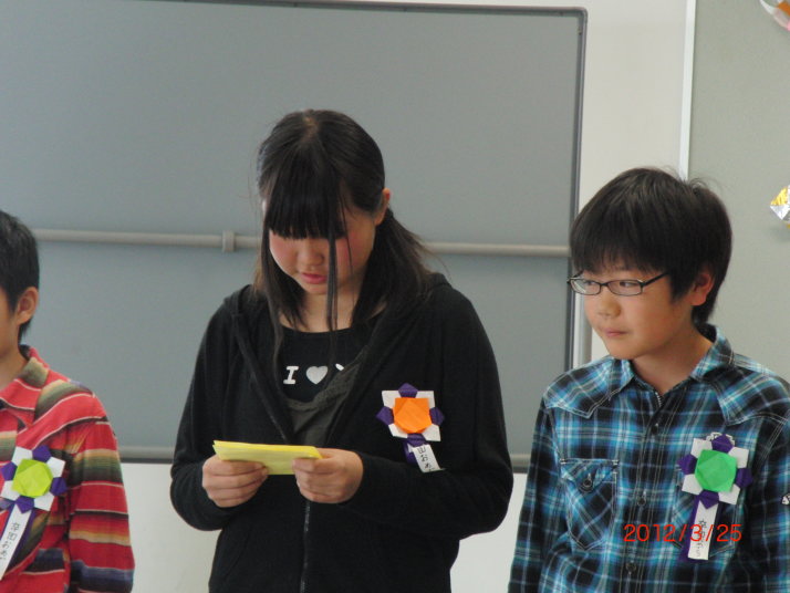 第一部は卒団式。先生からの贈り物とお祝いの言葉があり、卒団生は一人ひとり、卒団に際しての思いを述べました。