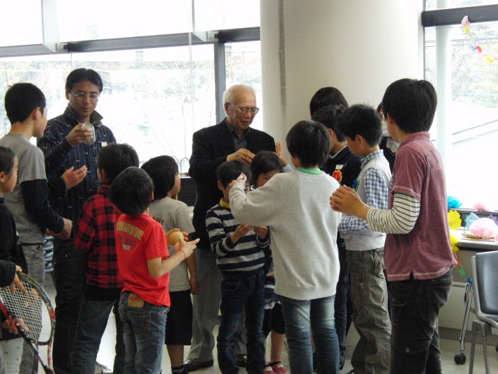 翌日、子供達から花束をお渡しし、みんなでお祝いしました。先生、これからもずっとテニスを教えてくださいね!