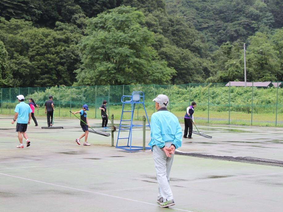 初日は雨だったので待機中はみんなで話をしたりあそんだり。その後はみんなでコート整備頑張りました。