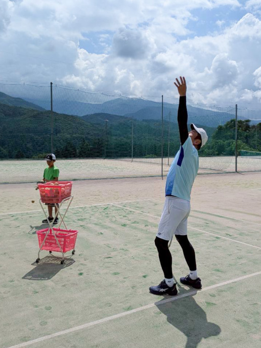 はるか遠くに球出しの上村コーチ